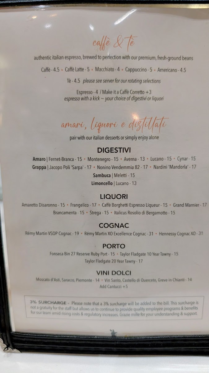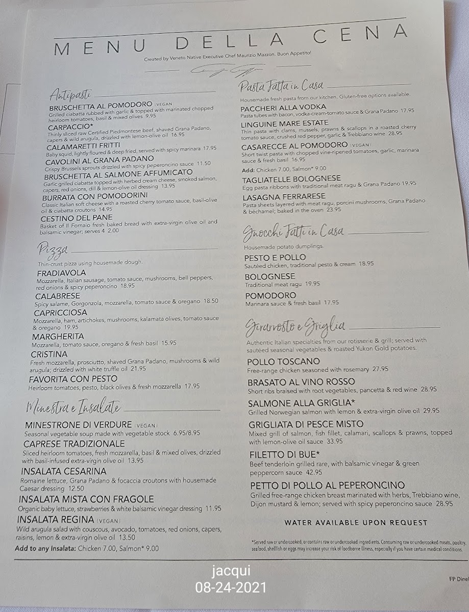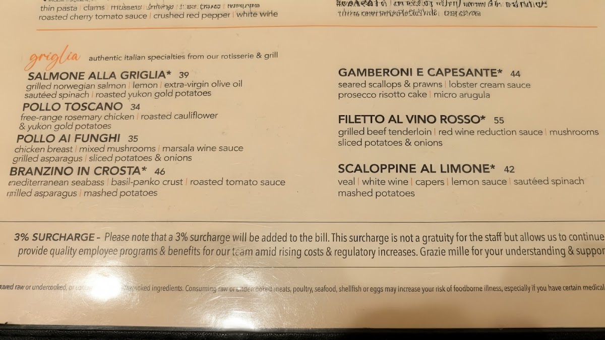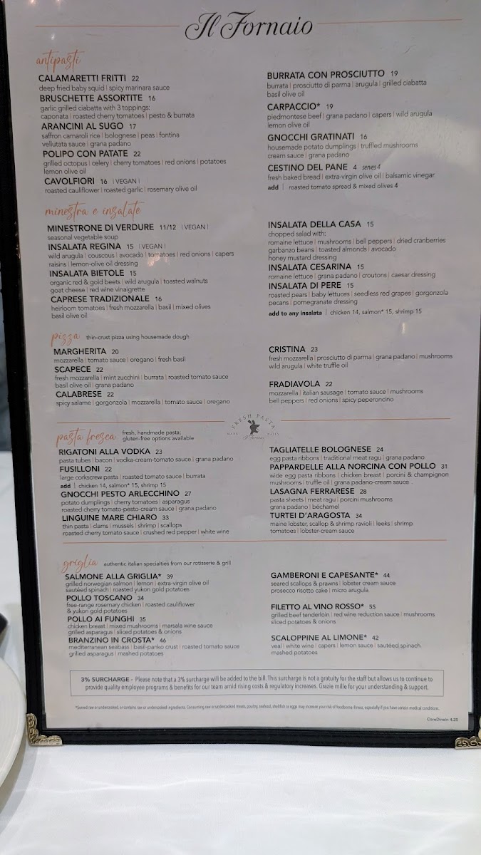 Features Salmone alla Griglia* & includes Insalata Cesarina, Rigatoni alla Vodka, Roasted Potatoes, Seasonal Vegetables, Freshly Baked Bread & Tiramisù *Please note, this item is not available on 11/27/24 or 11/28/24.